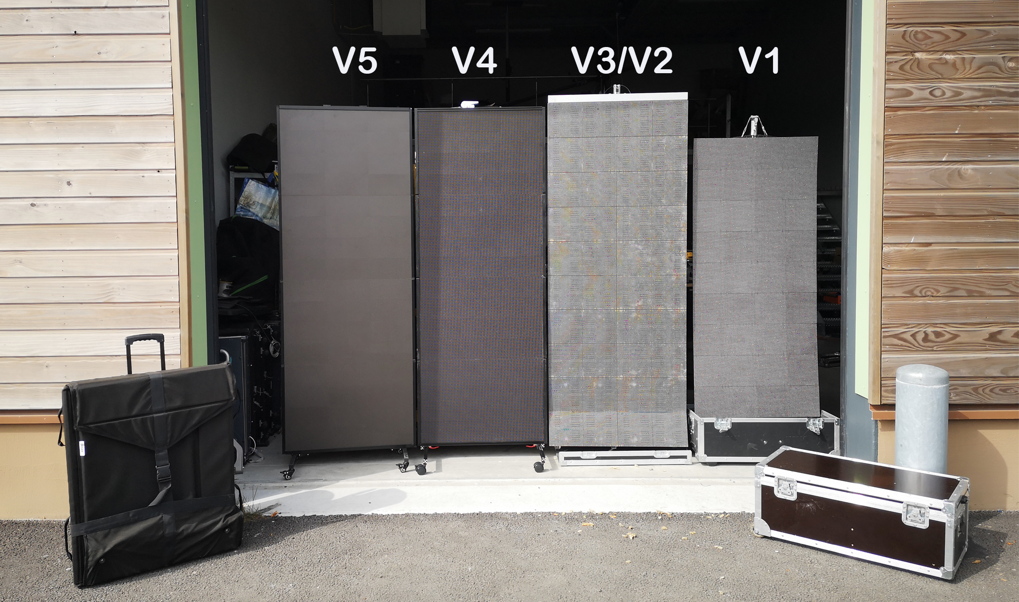 Les versions 2 et 3 sont similaires, elles proposent une définition de 6mm de pitch, l’écran est plus grand et la caisse de transport est moins visible une fois l’écran déplié. La différence entre les deux versions se situe au niveau du montage. La V2 propose un montage avec une manivelle et la V3 une solution de montage électrique.
